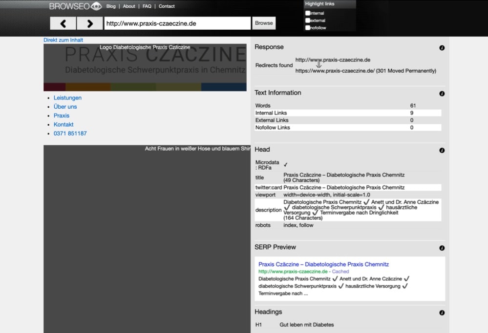 Abb. 2: Screenshot: Startseite einer diabetologischen Praxis mit Browseo. Browseo ist ein Browser, mit dem Sie Webseiten aus der Perspektive einer Suchmaschine betrachten können. (Quelle: www.browseo.net/?url=http%3A%2F%2Fwww.praxis-czaeczine.de. Zugegriffen: 13.02.2024)