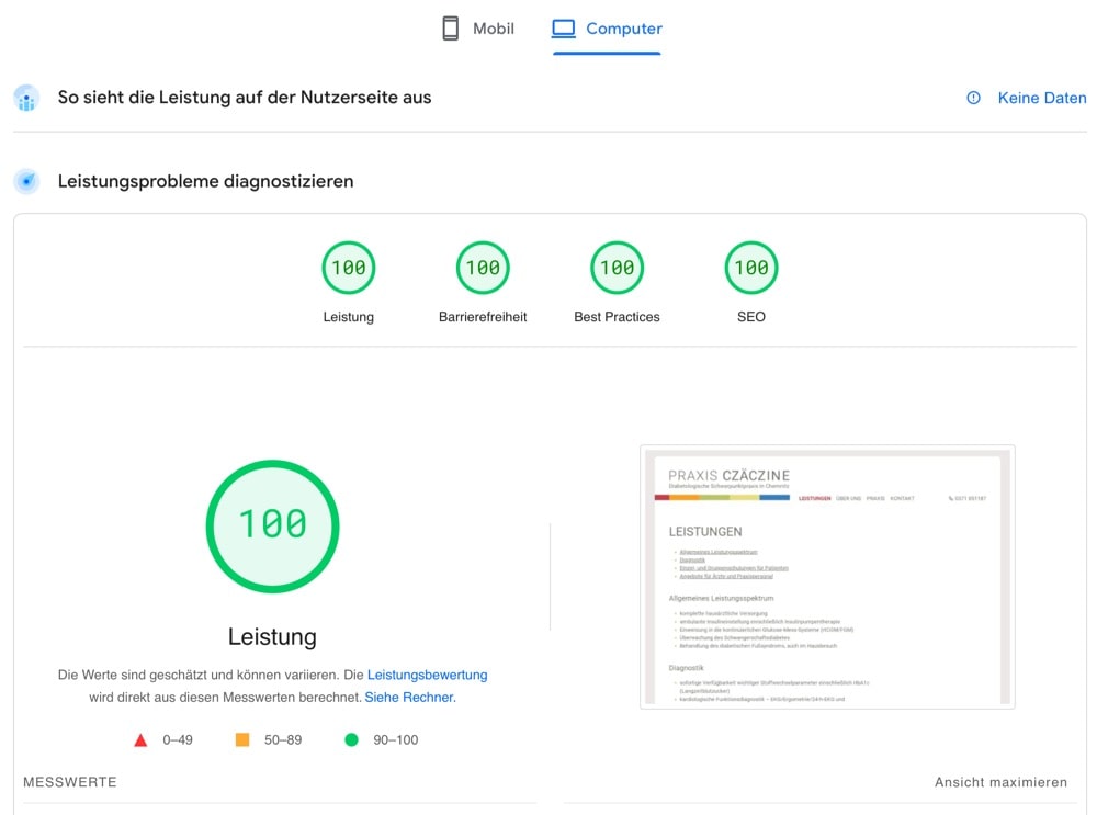 Abb. 8: Screenshot: Analyse einer Webseite (Quelle: PageSpeed Insights. pagespeed.web.dev/analysis/https-www-praxis-czaeczine-de-leistungen-html/qgub42xv74?hl=de&form_factor=desktop. Zugegriffen: 10.04.2024)