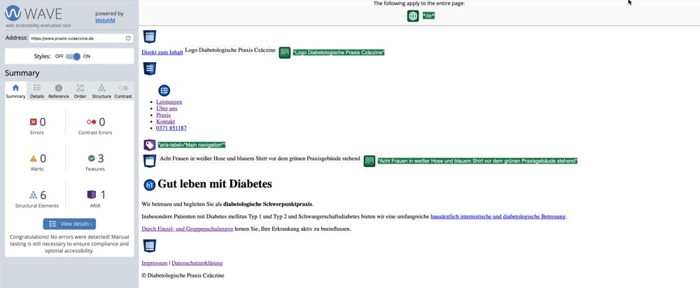 Abb. 9: Auswertung der Website www.praxis-czaeczine.de (Quelle: WAVE. wave.webaim.org/report#/www.praxis-czaeczine.de. Zugegriffen: 05.05.2024)